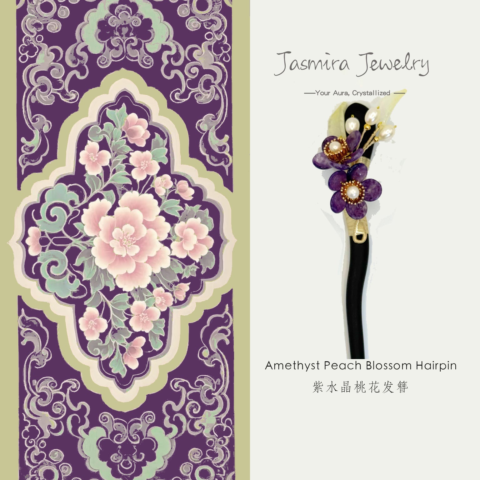 This hairpin captures the essence of nature in a delicate design. Transparent amethyst is carved into vivid peach blossoms, their deep and light purple hues refracting a mysterious glow, like ethereal blooms in the night. Natural pearls form budding flowers, their round, dewy luster complementing the peach blossoms perfectly. The ebony wood stem, with its fine, deep-set grain, provides a understated yet elegant base for the sparkling gemstones. Classical and refined, wearing this hairpin is like tucking a slice of spring forest into your hair—exuding gentle grace and timeless Oriental charm.