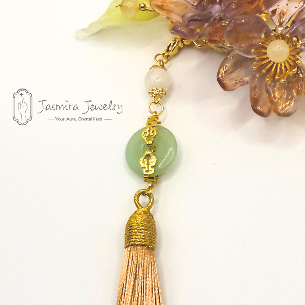 This hairpin features layered peach blossom petals meticulously carved from glass, with a rich caramel hue dotted with delicate golden flecks—like peach blossoms bathed in sunset glow. The hairpin tip is adorned with safety buckle-inspired dangle tassels that sway gently with each step, creating a soft, melodious sound. Symbolizing "graceful movement with every step" and "peace at every pace," it blends Eastern romance with auspicious blessings, adding a touch of classical elegance and 灵动 (lithe) charm to any hairstyle.
