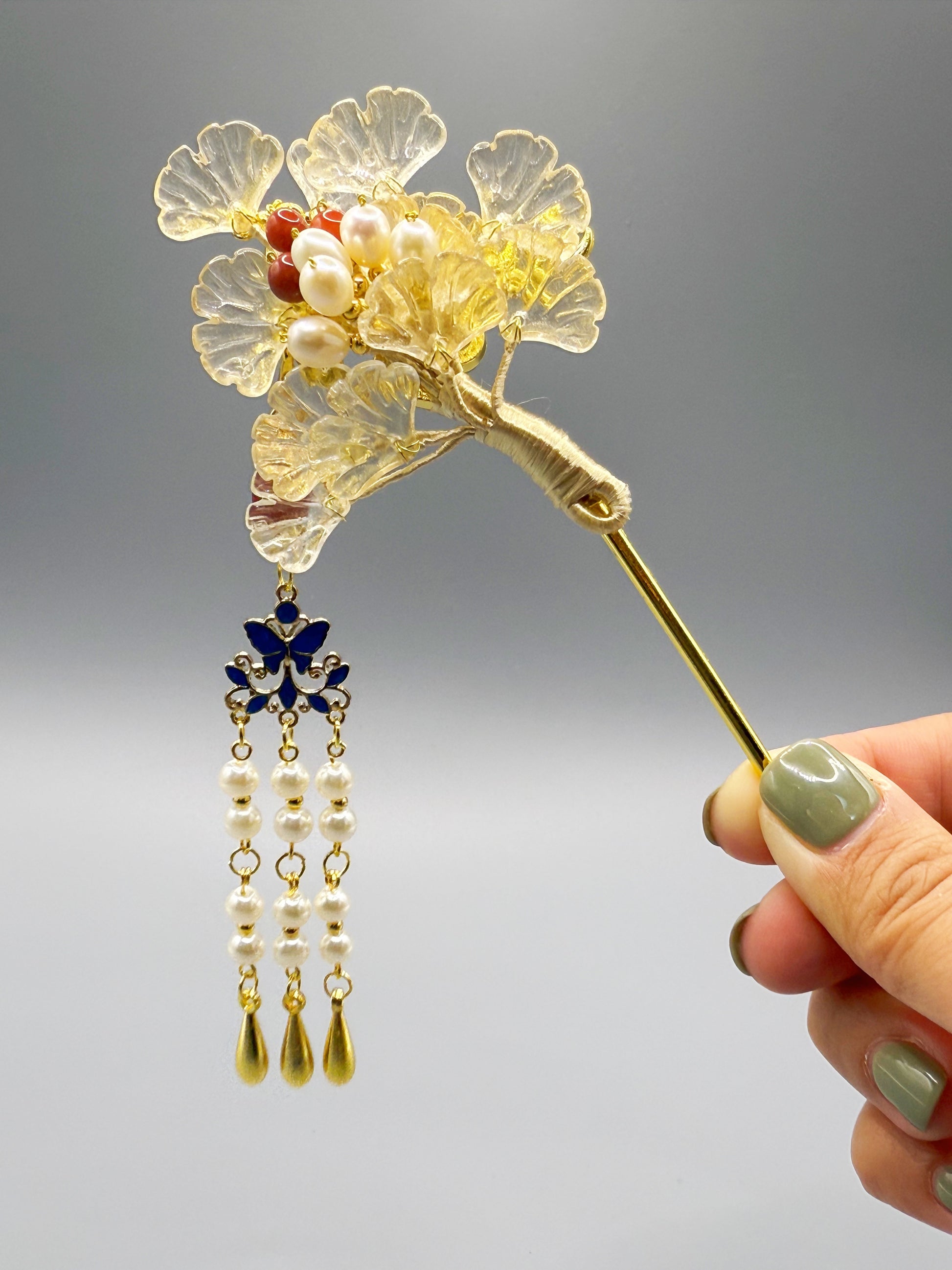 Ginkgo Biloba-inspired Glazed and Pearl Hairpin