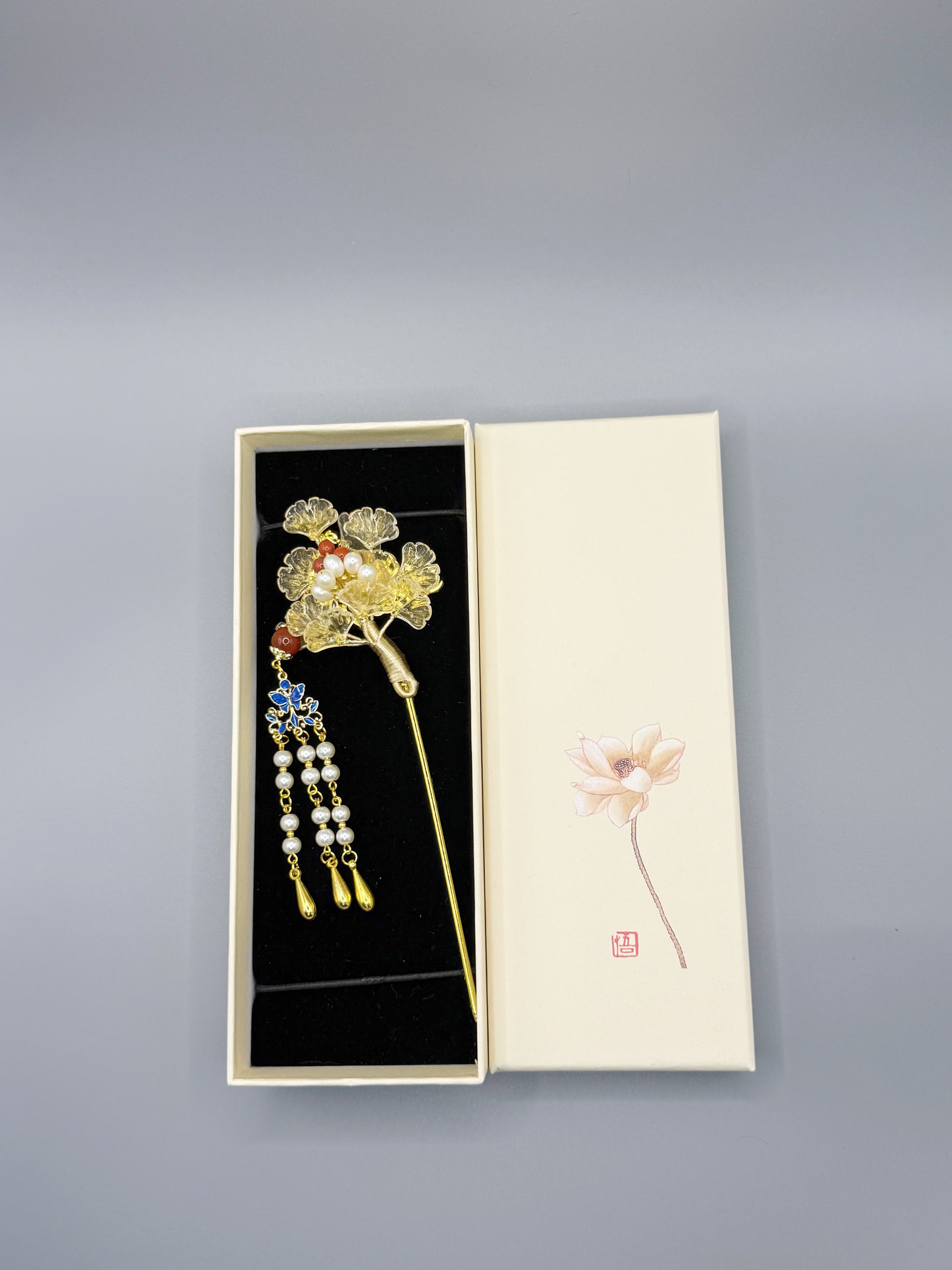 The ginkgo leaf is fan-shaped, symmetrical on both sides, and combines the two sides into one, which is regarded as a symbol of the loyalty and eternity of love. Ginkgo trees have an extremely long lifespan and can live for more than a thousand years. Therefore, the ginkgo leaf also implies that love can be as long-lasting and stable as a ginkgo tree, remaining steadfast and unswerving even after going through the trials of time. This hairpin created with the ginkgo leaf as the theme symbolizes the everlasting and unchanging love in Chinese culture.