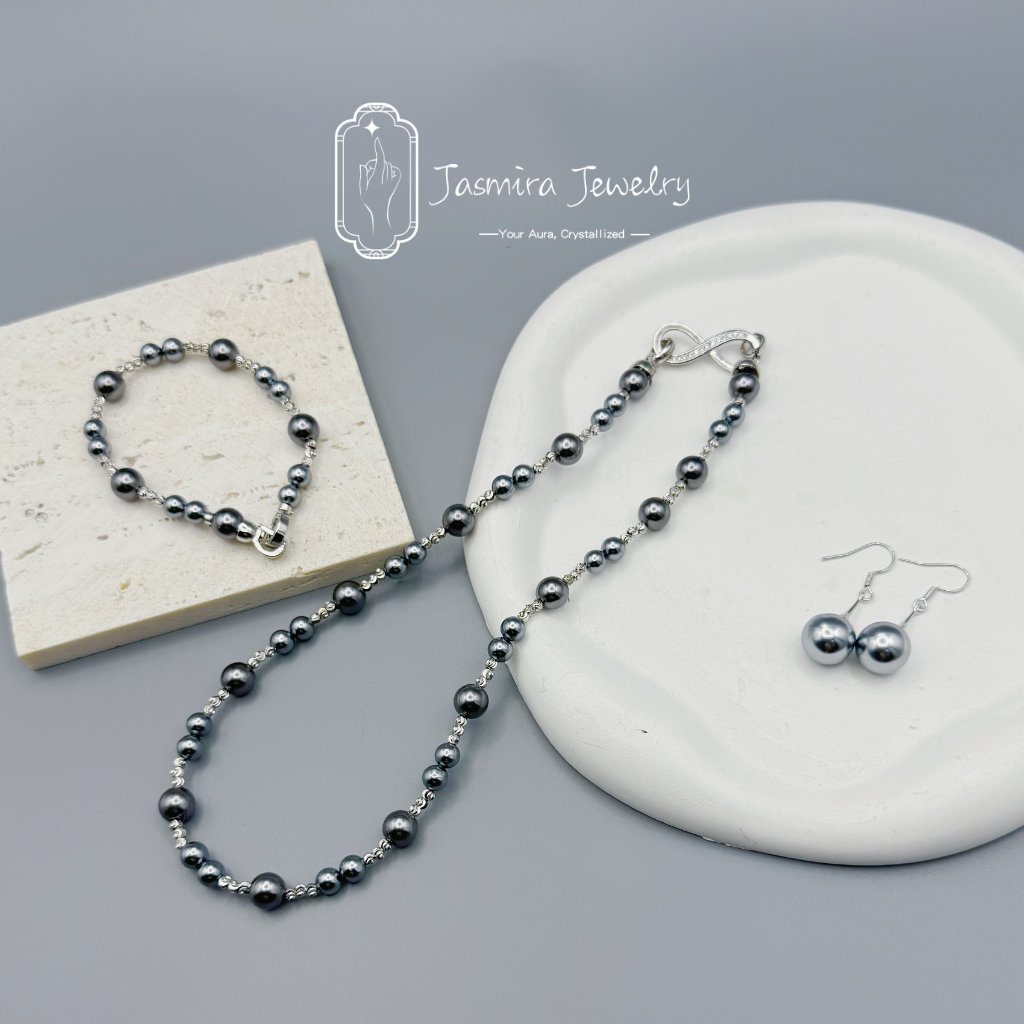 Crafted from natural shell pearls, this bracelet features an elegant interplay of large and small beads, creating a dynamic rhythm around the wrist. The deep, night-like luster shimmers with the subtle textures of the ocean, while the minimalist chain design exudes understated elegance. As it moves, the pearls sway gently, adding a touch of subtle yet distinctive charm to any outfit.