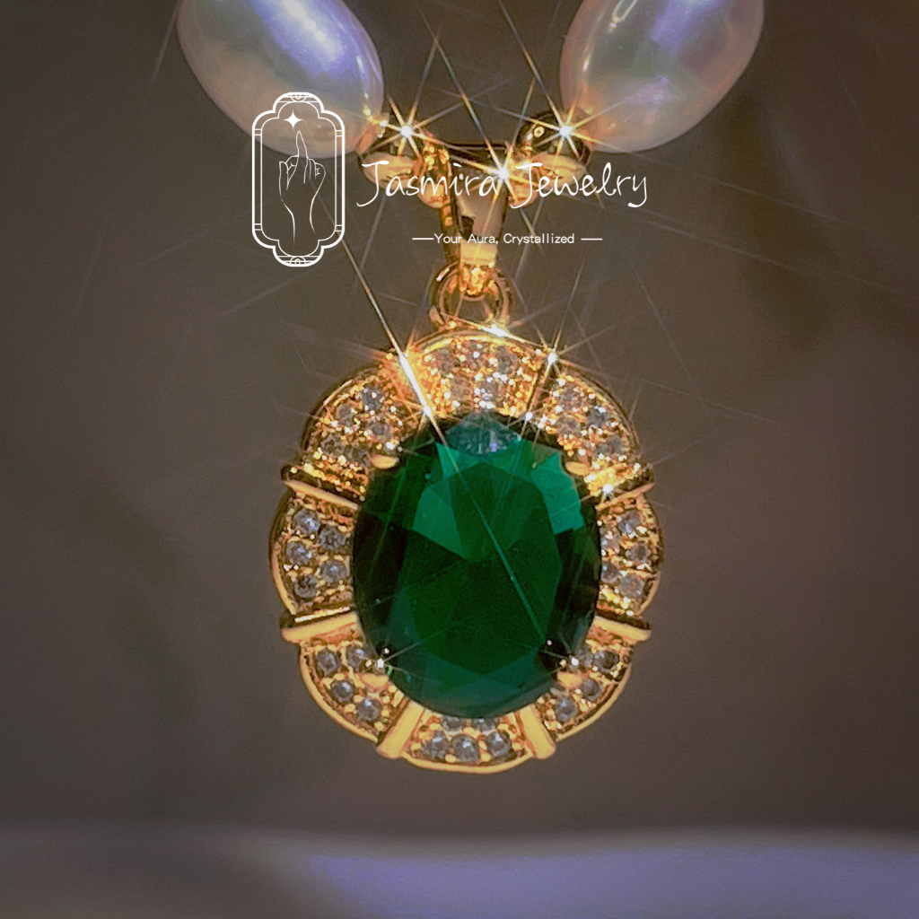 Featuring oval-shaped natural freshwater pearls, each bead exudes a warm, moonlit luster, strung to evoke a gentle river of light. At its center rests a pigeon's egg-shaped green zircon pendant, whose rich hue contrasts beautifully with the pearls' soft elegance. The geometric facets of the zircon catch the light, creating a radiant sparkle that complements the pearls' subtle glow. With a sleek, minimalist chain, this necklace drapes elegantly around the neck, adding a touch of understated luxury to both everyday and formal looks—effortlessly blending sophistication and timeless charm.