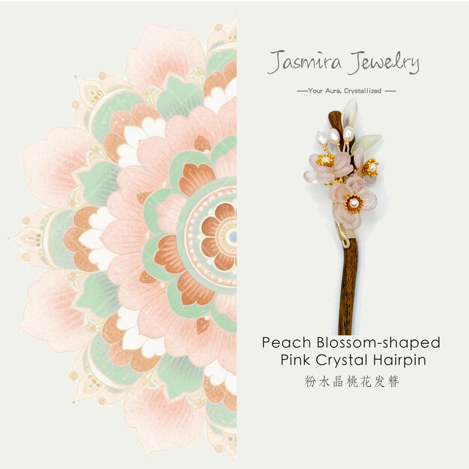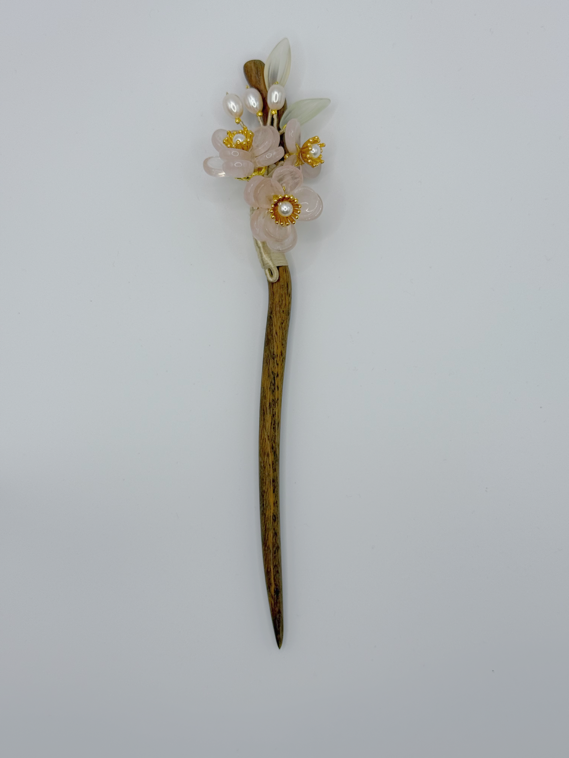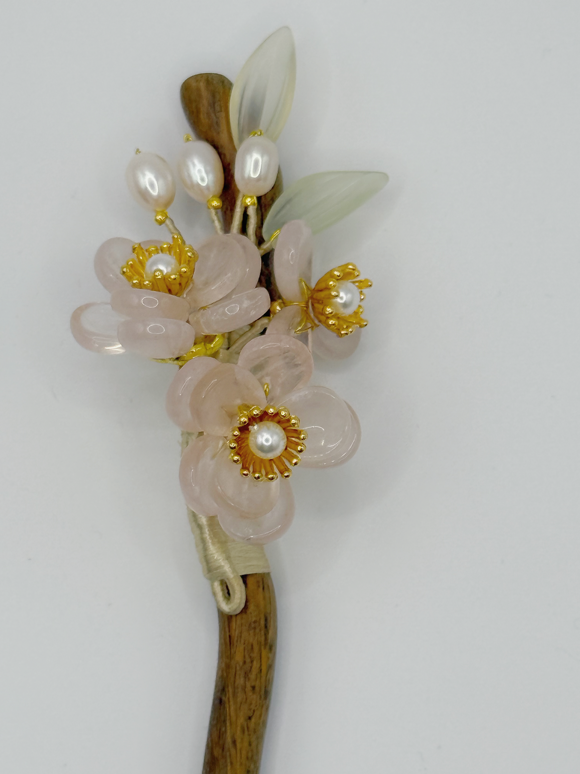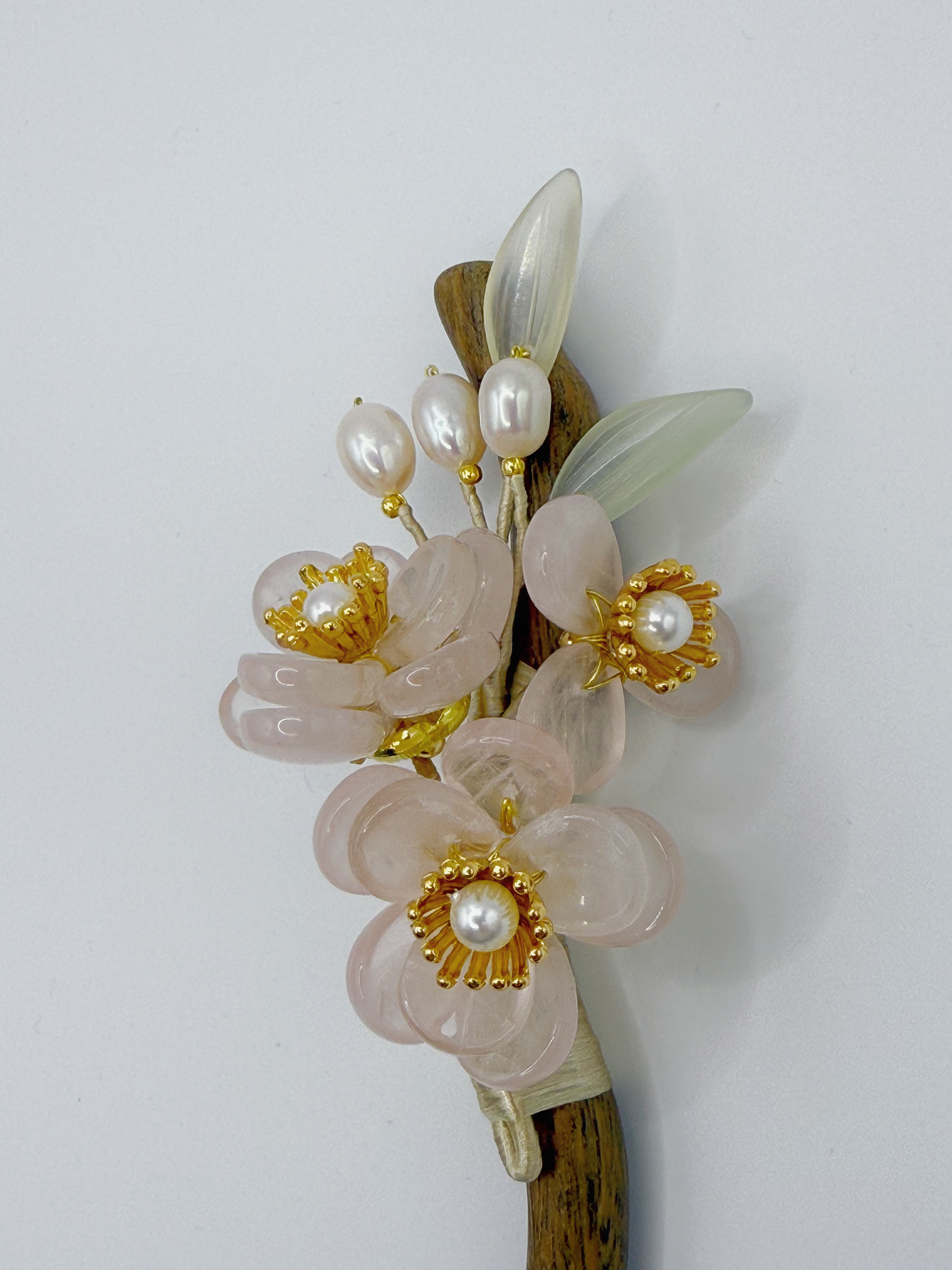 Rose quartz is also known as the "stone of love". It can promote harmonious interpersonal relationships and is particularly helpful in enhancing one's love fortune. In traditional Chinese culture, peach blossoms are a symbol of love. A peach blossom hairpin made of rose quartz is suitable for those who are longing for love or hoping to improve their intimate relationships. It is regarded as a symbol of expressing love and attracting fate.