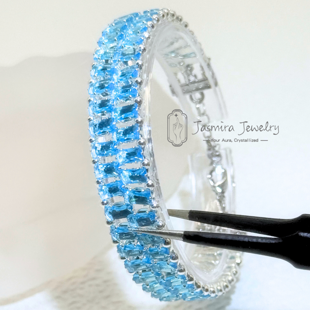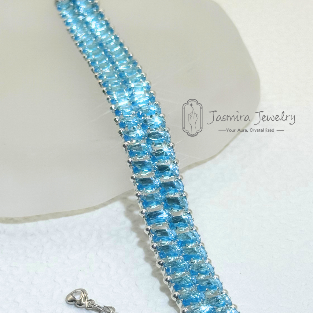 Crafted with sea-salt blue zircon stones, each gem resembles wave-polished sea glass, holding the deep azure and vitality of the ocean within its translucent hue. The bracelet curves gently around the wrist, shimmering with delicate light as it moves—like weaving the whispers of waves and the sighs of sea breeze into a wearable story. Slip it on to embark on a romantic oceanic journey.
