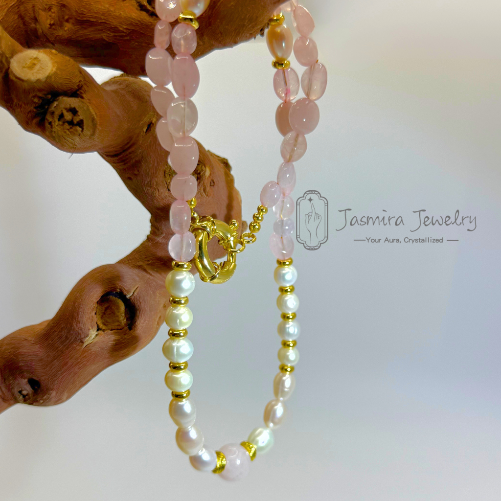 The "Spring Message" necklace is intricately woven with rose quartz and natural pearls. The 10mm main stone, a piece of hibiscus quartz, resembles the spring sunset, radiating a gentle glow. The irregularly shaped rose quartz side stones are like scattered flower petals, lively and vivid. Round pearls are strung among them, just like dewdrops adorning flower branches. When worn, the romance and poetry of spring flow around the neck, softly conveying good wishes and tender affection.